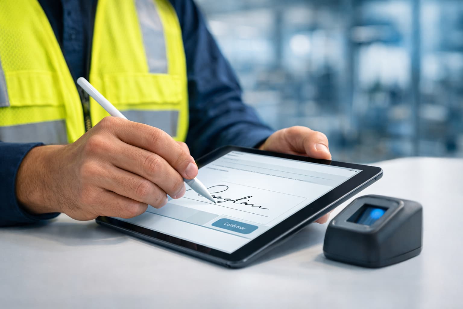 Coleta da assinatura na ficha de EPI por impressão digital, garantindo validade jurídica.
